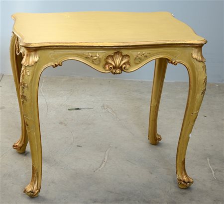 Tavolino da salotto in legno laccato e dorato con piano rettangolare, gambe sagomate decorate a motivi floreali (cm 72x63x52)