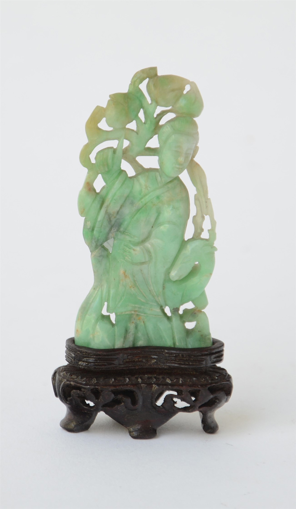 Ffigura con animale, scultura in giadeite verde mela con base in legno (difetti) Cina, sec. XX (h. 7 cm.)
