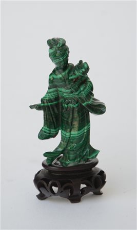 Scultura in malachite raffigurante figura femminile con fiori, base legno (difetti) Cina, sec. XX (h. 7 cm.)