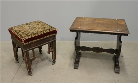Lotto composto da uno sgabello con fascia traforata e un tavolino rettangolare con gambe sagomate (difetti)