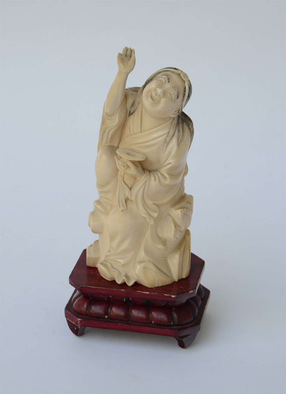 Scultura in avorio raffigurante monaco iscritta sotto la base, poggiante su base in legno (difetti e mancanze) Cina sec. XX (h. 16 cm.)