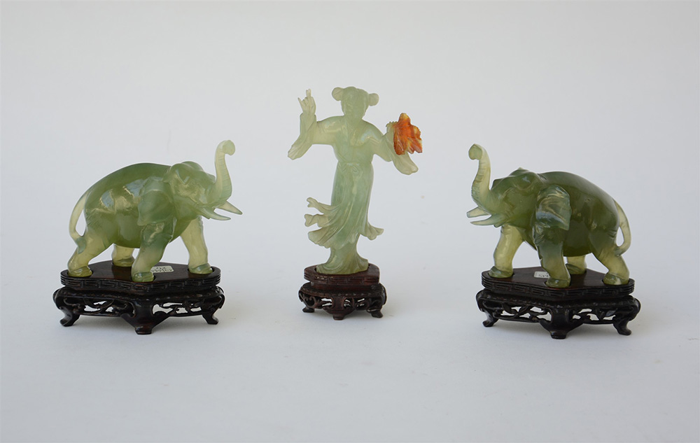Lotto composto da tre sculture in pietra dura raffiguranti elefanti e figura femminile, misure diverse. Basi in legno (difetti) Cina, sec. XX