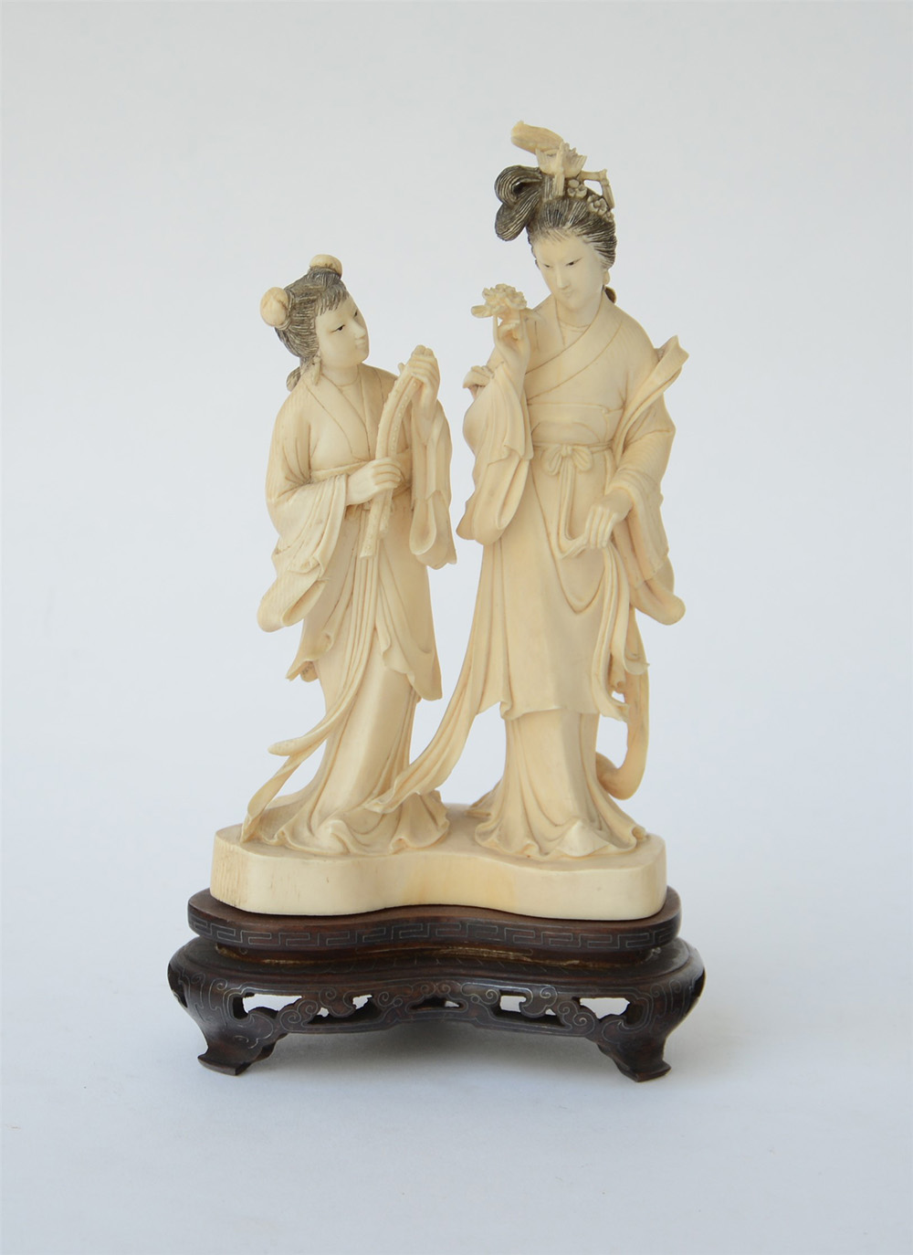 Gruppo in avorio scolpito raffigurante figure femminili, con bese in legno (difetti) Cina, sec. XX (h. 19 cm.)
