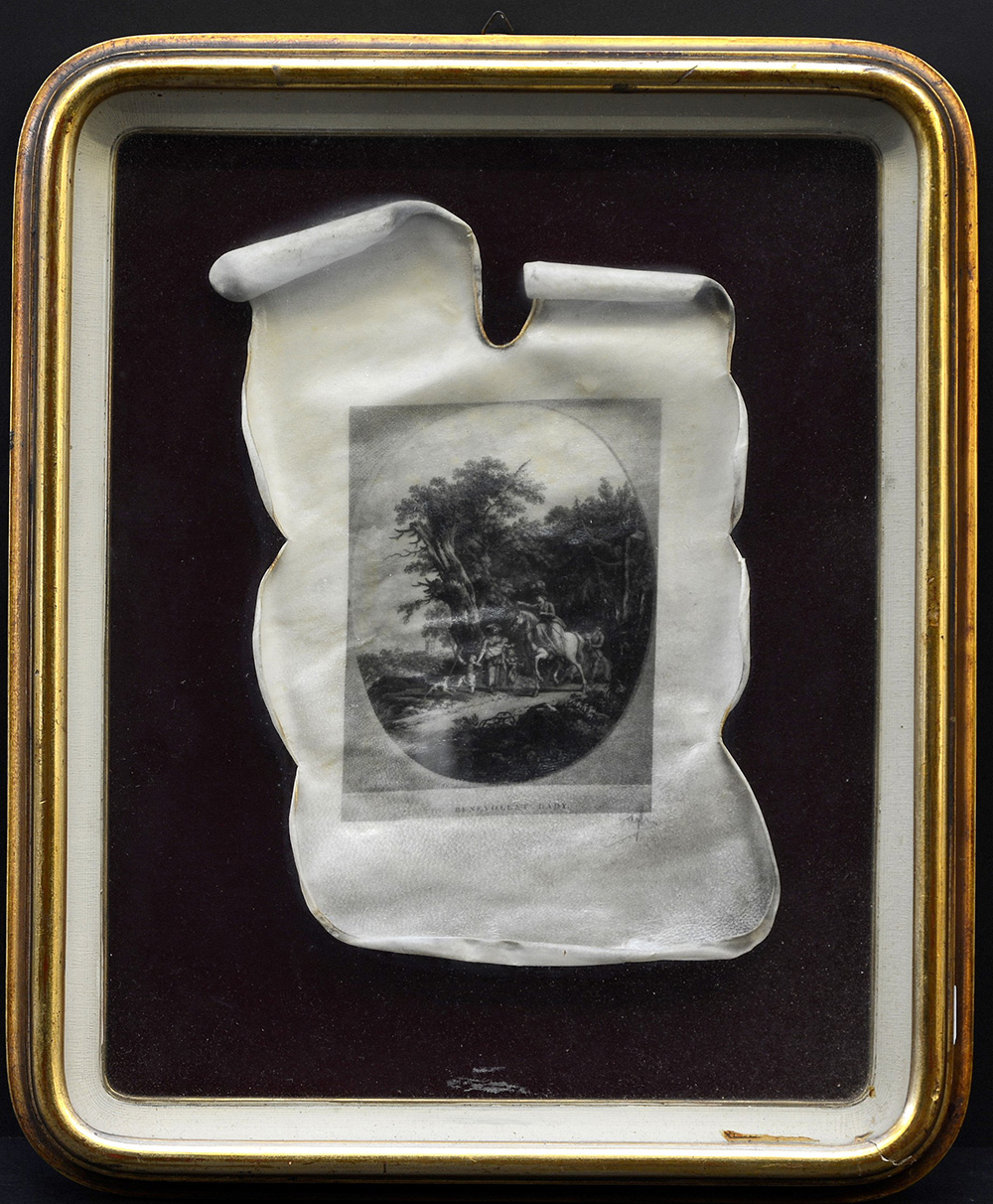 Firma indecifrata "Paesaggio" incisione su pergamena (cm 23x19) firmata in basso a destra, in cornice (difetti)