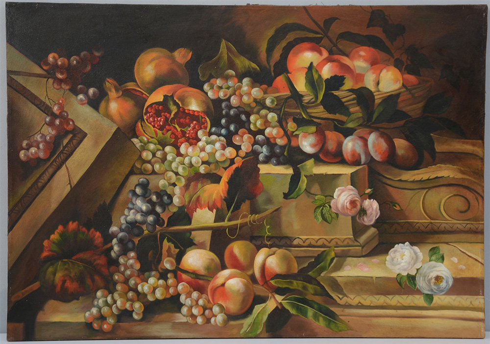 Ignoto "Fiori e frutta" olio su tela (cm 70x100)(difetti)