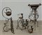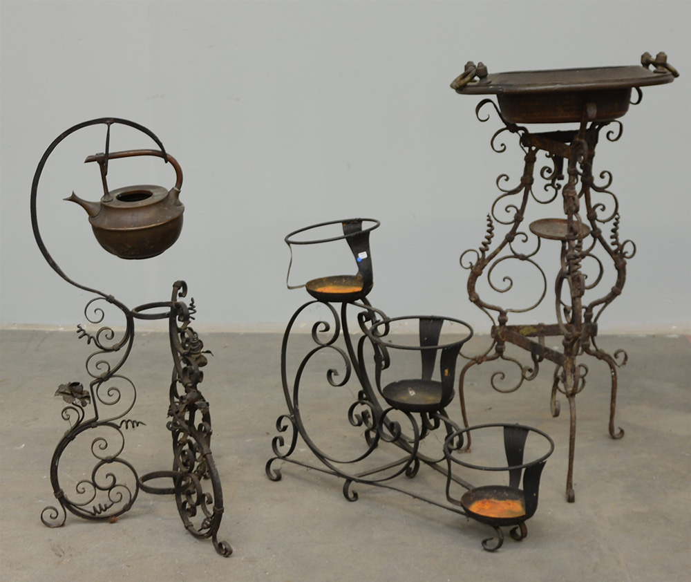 Lotto composto da due trespoli in ferro battuto, con catino e teiera non pertinenti, ed un portavasi a tre vani (difetti e mancanze)