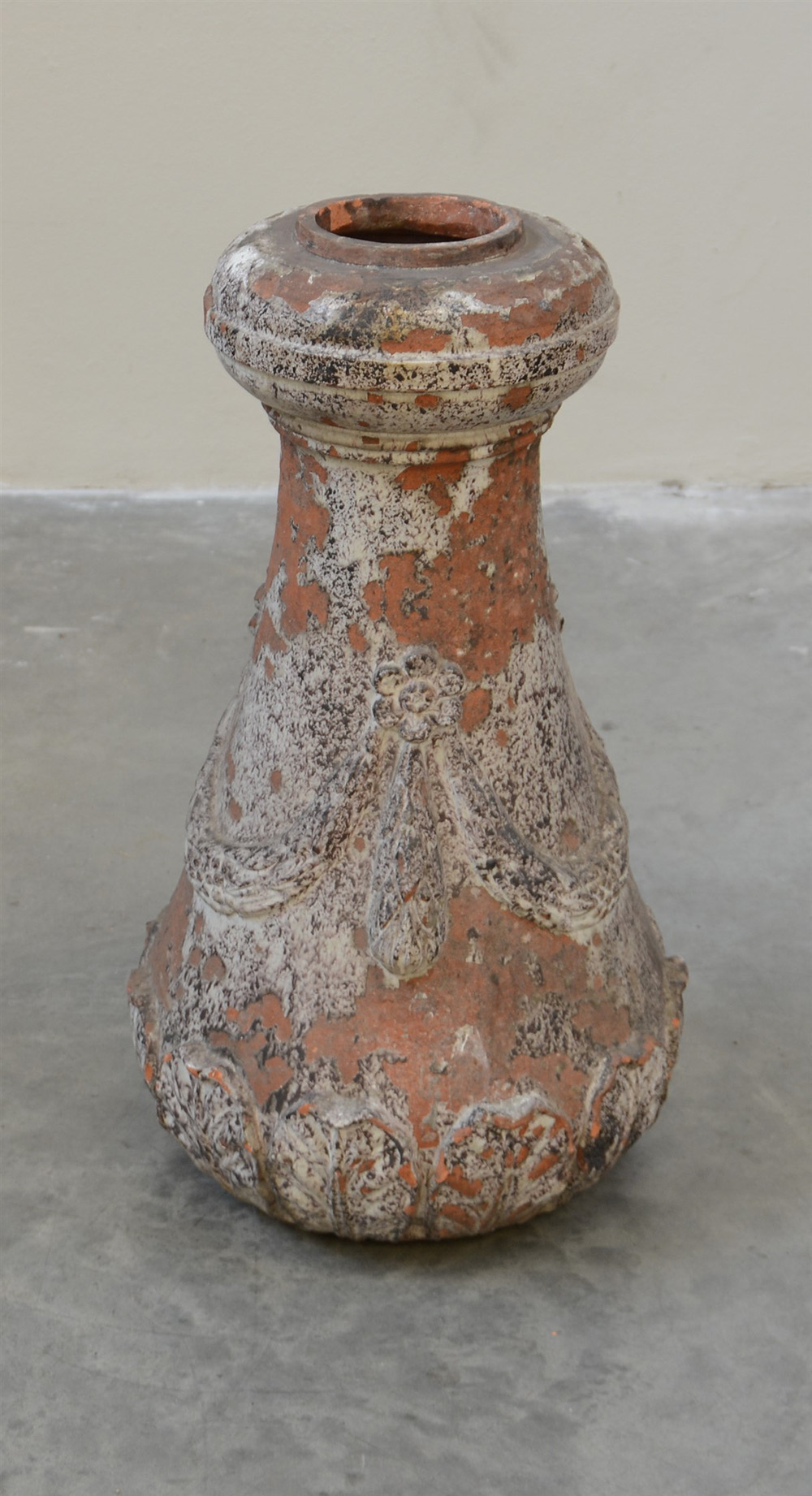 Lotto composto da un vaso in terracotta smaltata decorato a foglie e festoni...