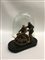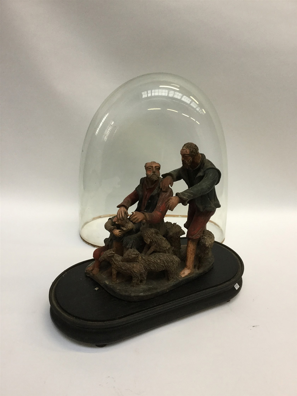 Gruppo scultoreo in creta dipinta raffigurante pastori con pecore (h cm 30); completa di basamento in legno ebanizzato e campana in vetro (difetti)