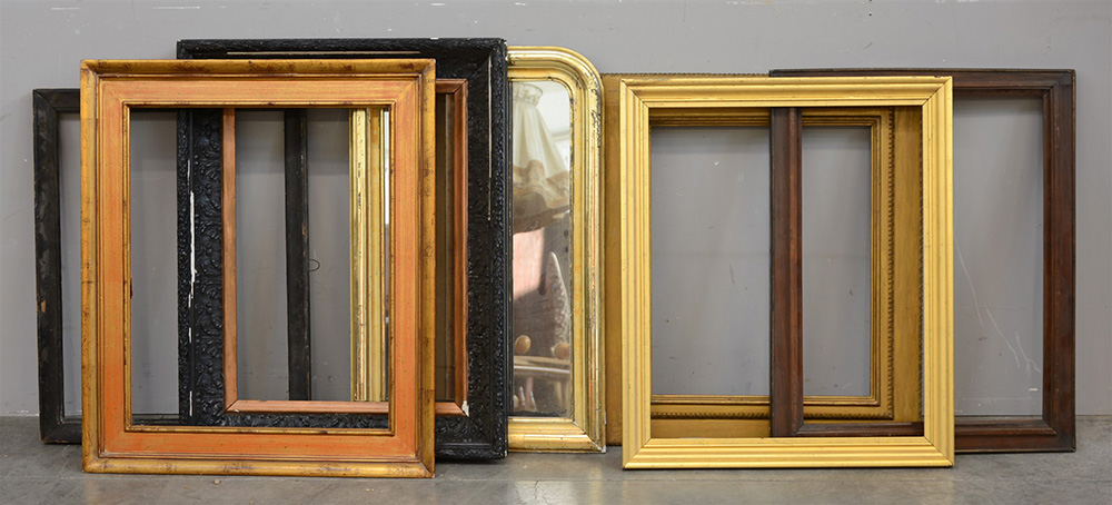 Lotto composto da sei cornici diverse e uno specchio (difetti)