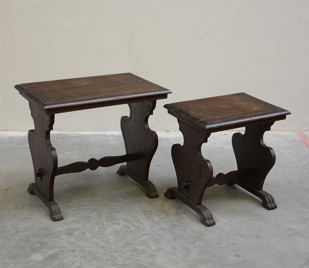 Lotto composto da due tavolini neorinascimentali con sostegni ad asso di coppe e piedi a zampa ferina; inizio sec. XX (cm 66x59x41 e 50x52x37) (difetti)