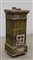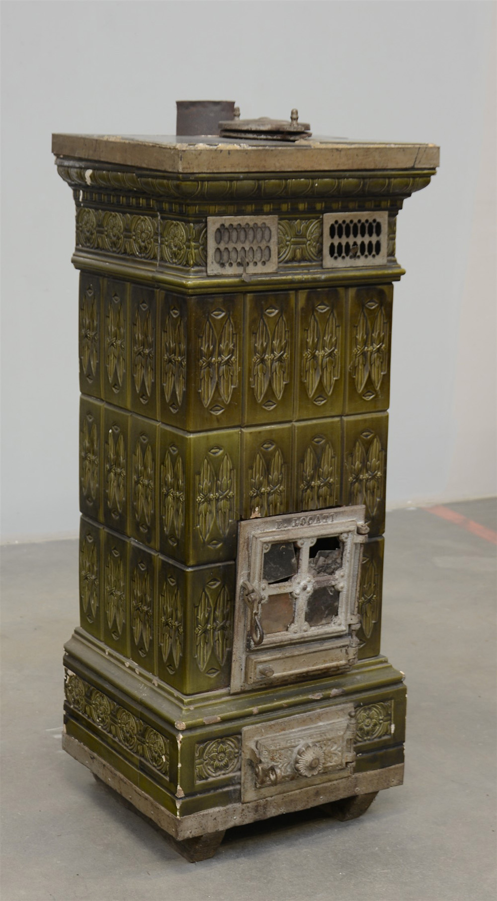 Stufa verticale rivestita in piastrelle di maiolica verde con decoro floreale (cm 50x122x50) (difetti e mancanze)