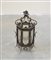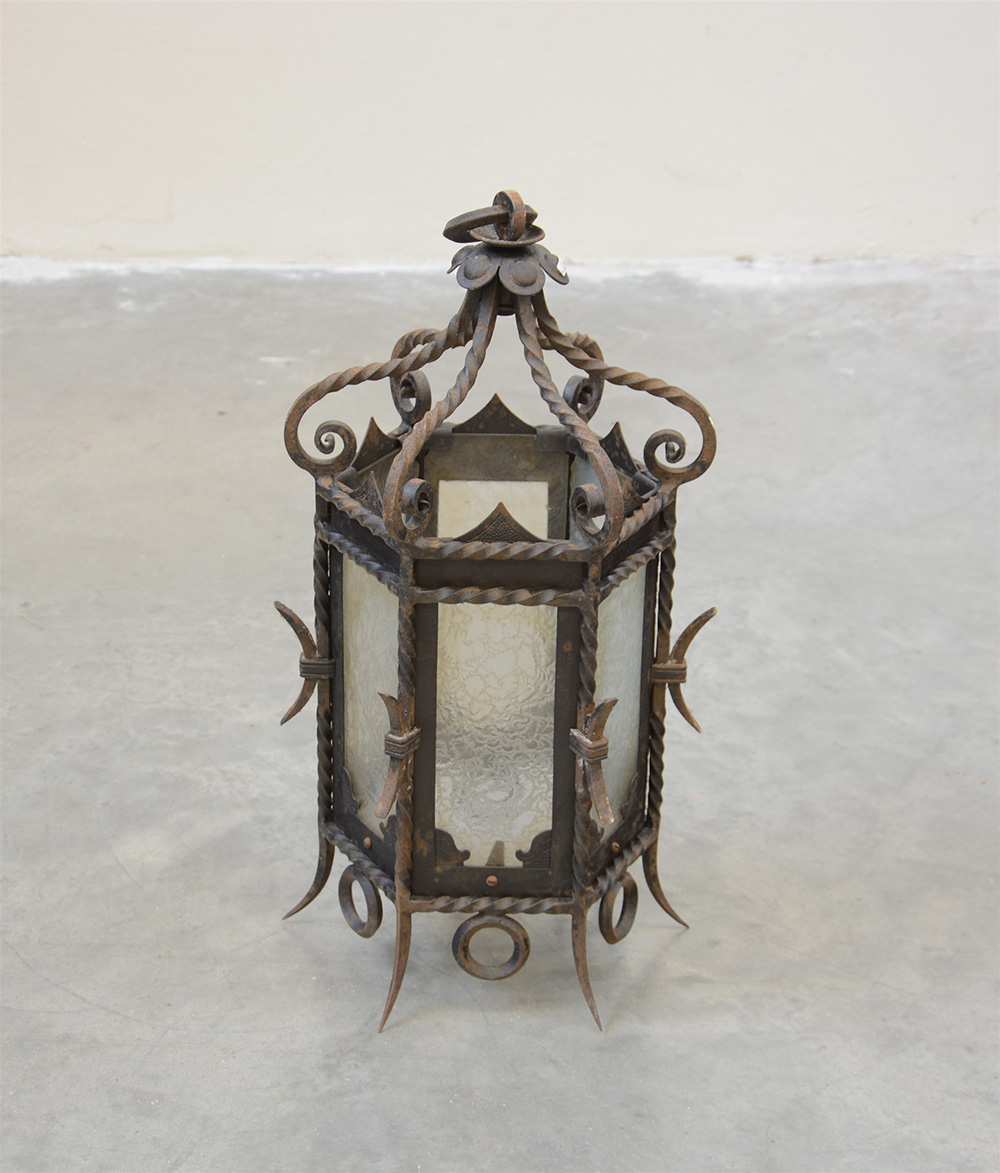 Lampada da portico esagonale ad una luce in ferro battuto e vetri smerigliati (h cm 70) (difetti e mancanze)