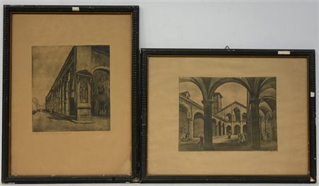 Coppia di acqueforti raffiguranti scorci di Milano firmate e titolate in basso. In cornici (difetti)