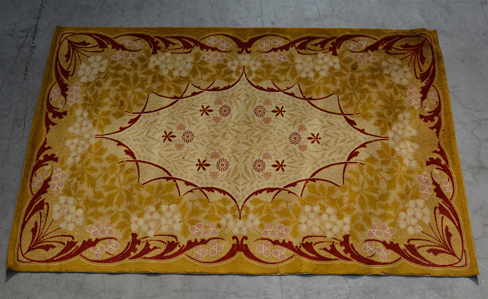 [Tappeti] Tappeto Liberty, Italia, fine secolo XIX. Disegno a volute, fiori e foglie nei toni del bianco, bordeaux, senape e beige (cm 238x162) (difetti)