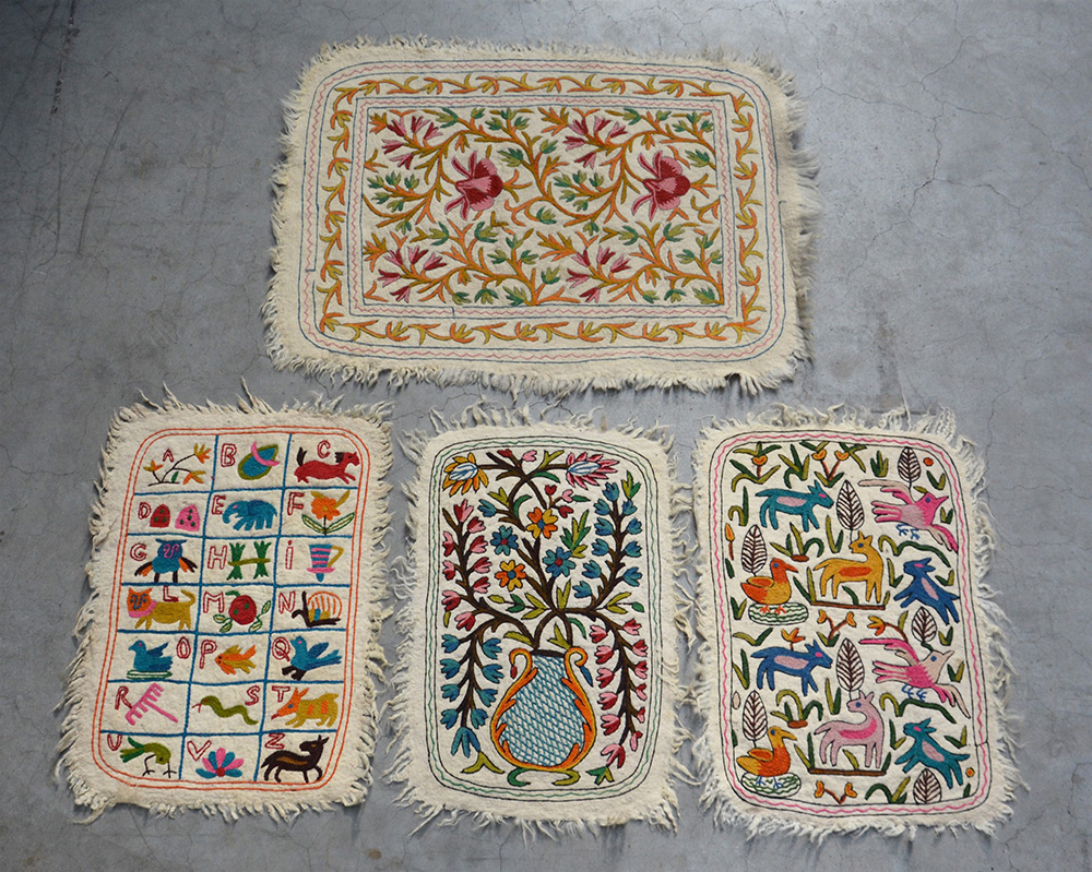 [Tappeti] Lotto composto da quattro feltri ricamati in lana policroma (max 124x90 cm) (gravi difetti)