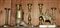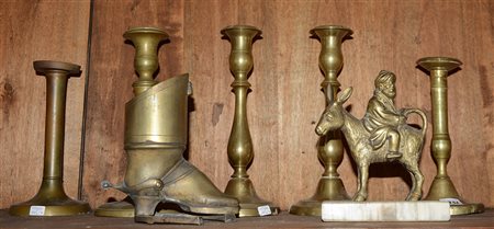 Lotto composto da cinque candelieri e due soprammobili in ottone (difetti)