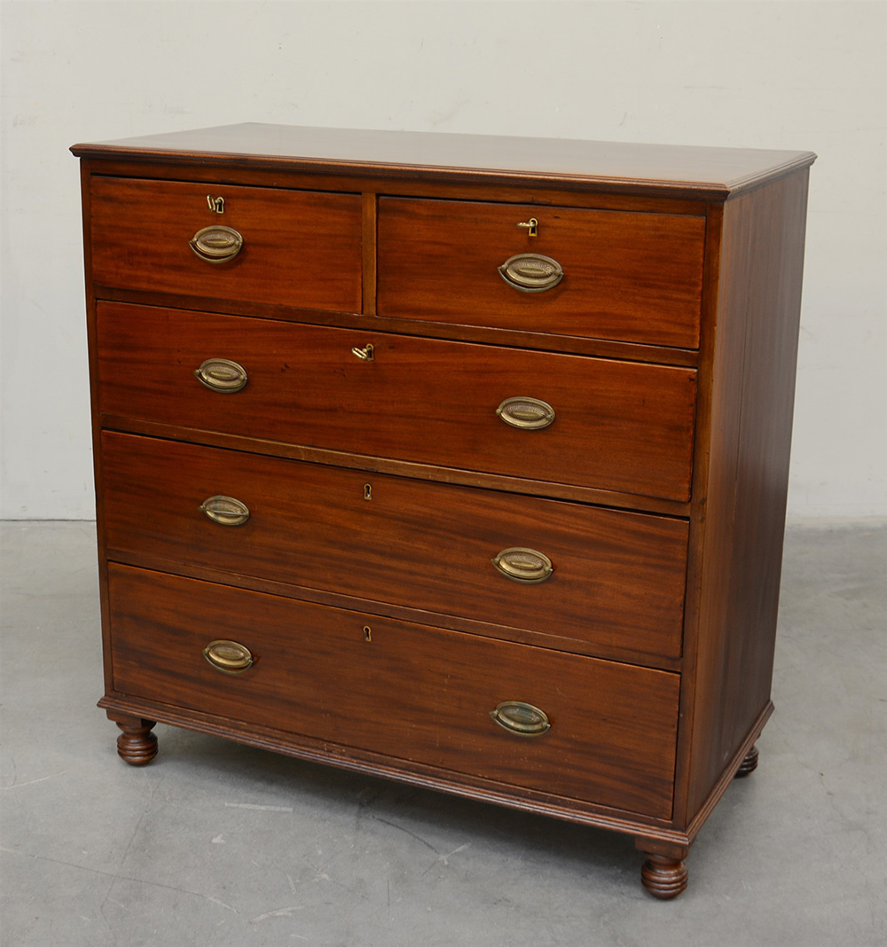 Comò in mogano a due cassetti in linea sottopiano e tre grandi sul fronte. Piedi torniti. Inghilterra fine sec. XIX (cm 105x107x52) (difetti)