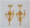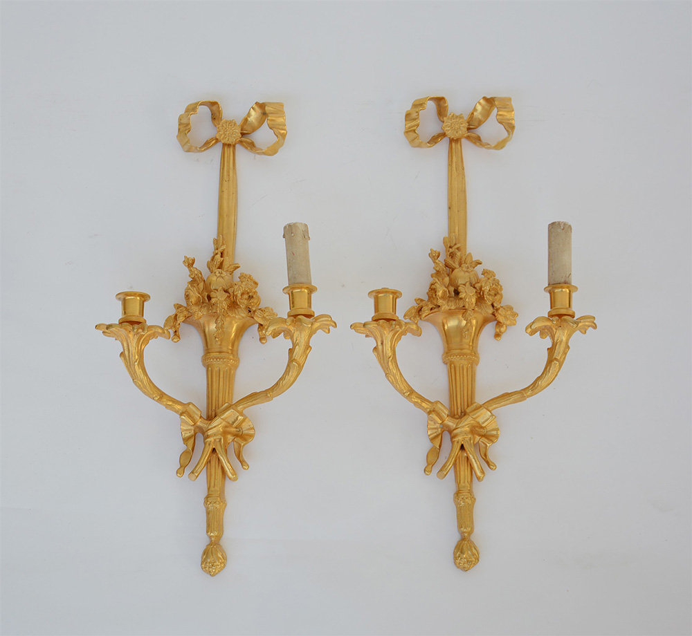 Coppia di appliques a due fiamme in bronzo dorato decorate a cesti fioriti e fiocchi. Portacandele a finti rami (h. cm 54)