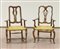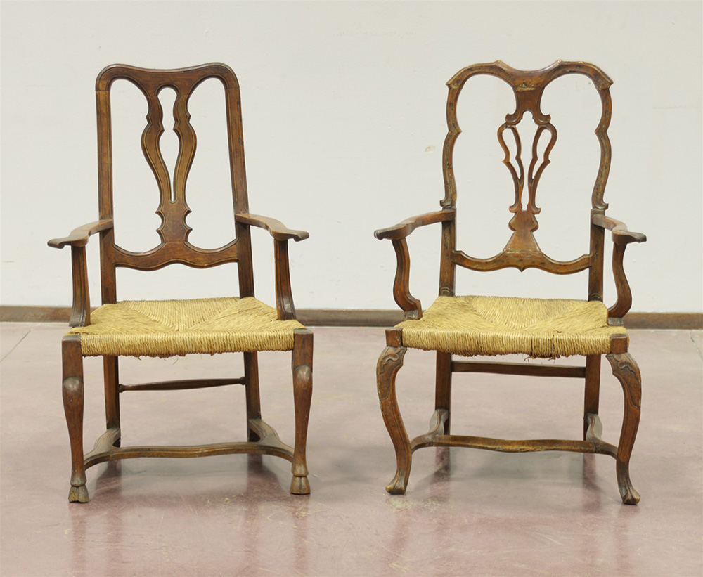 Lotto di due antiche poltrone in legno intagliato, braccioli, gambe e traverse sagomate (difetti)