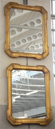 Coppia di cornici sagomate a vassoio in legno inciso e dorato con specchi (cm...