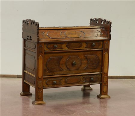 Antica madia in stile rinascimentale interamente pannellata, due antine ribaltabili e un cassetto alla base (cm 112x110x58) (difetti)