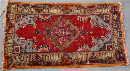 [Tappeti] Tappeto , Anatolia, inizio secolo XX. Disegno a medaglione su fondo rosso. Bordura con moschee (cm 151x90) (difetti)