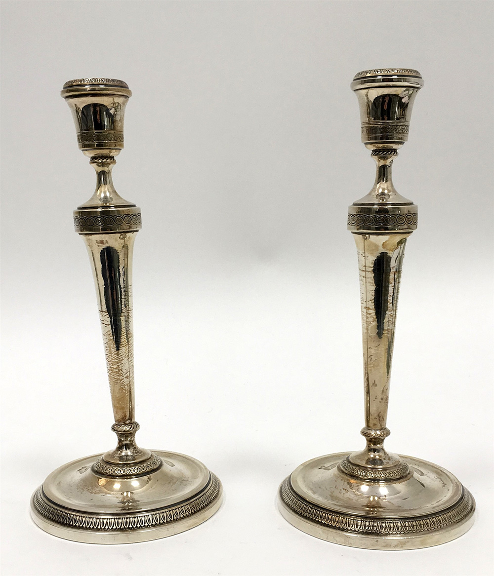 Coppia di candelieri in argento. Italia, metà del sec. XX (gr 350 ca.) (difetti)