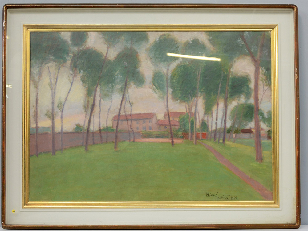 Nino Guerri "Paesaggio" 1944, olio su tela (cm 70x100) firmato e datato in basso destra. Al retro dipinto ad olio con paesaggio ed etichetta sulla cornice della Galleria Bolzani, Milano. In cornice