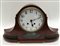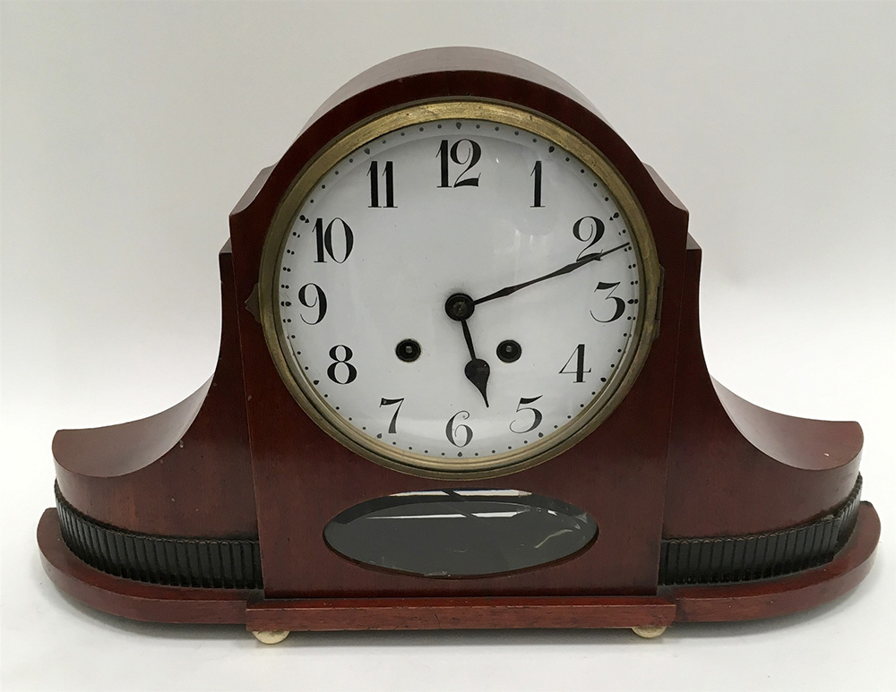 Orologio da camino con cassa in legno di forma sagomata con fascia ebanizzata, quadrante smaltato a numeri arabi. Carica settimanale, suoneria ore mezze su gong (difetti)