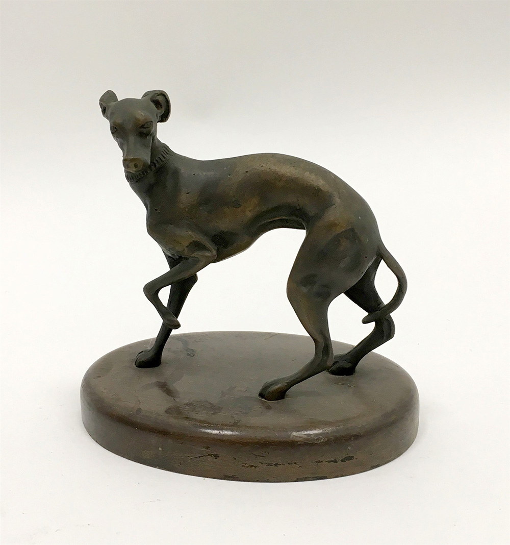 Ignoto "Levriero" scultura in bronzo (h cm 14) montato su base ovale in legno (difetti)