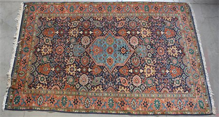 [Tappeti] Tappeto caucasico, secolo XX. Disegno geometrico policromo su fondo blu (cm 290x198)(difetti)