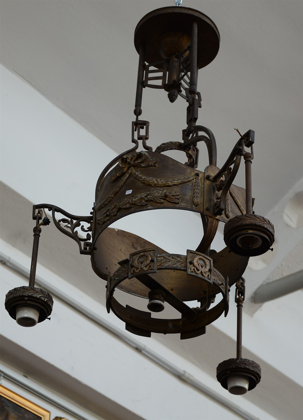 Lampadario in metallo a tre luci decorato a motivi vegetali e nastri, bocce...