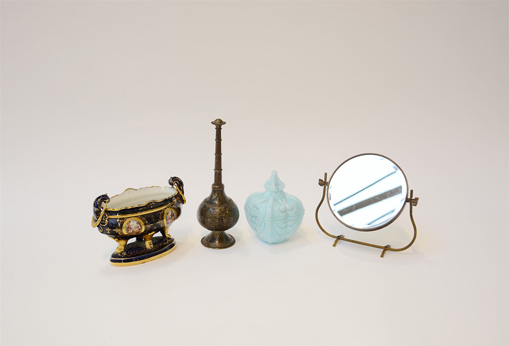 Lotto composto da uno spargi profumo, un piccolo centrotavola di porcellana, una scatola in opaline ed uno specchietto da tavolo
