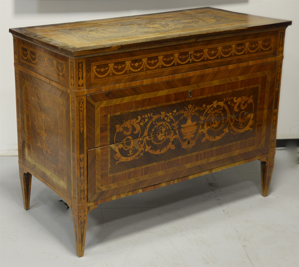 Como' Luigi XVI a due cassetti grandi ed uno piccolo sottopiano interamente lastronato, filettato ed intarsiato a vasi con fiori, girali fogliate e motivi vegetali, gambe rastremate (cm 120x91x59)(difetti e mancanze)