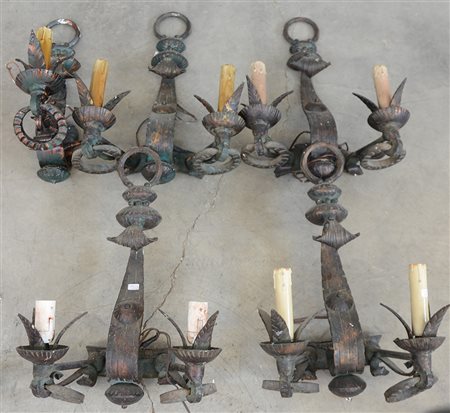 Lotto composto da quattro appliques a due fiamme ed una ad una fiamma, in ferro battuto (difetti)