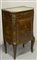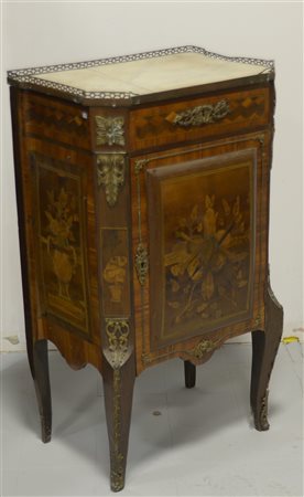 Mobiletto scantonato interamente lastronato, filettao ed intarsiato a vasi con fiori e marquetterie. Fronte ad un cassetto ed un anta intarsiata a strumenti musicali, piano in marmo decorato da ringhierina traforata, gambe mosse, decorato da fregi e scarpette in bronzo cesellato. Francia fine secolo XIX (cm 58x98x40)(difetti)