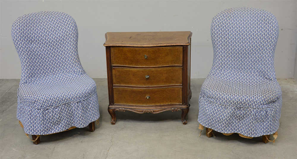 Lotto composto da due sedie da balia ed un comodino ad un anta e cassetto (difetti)
