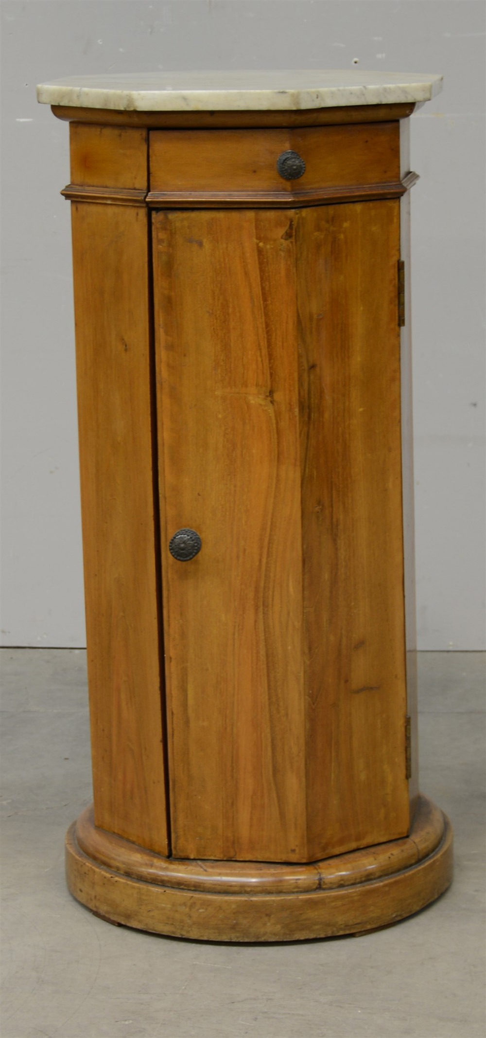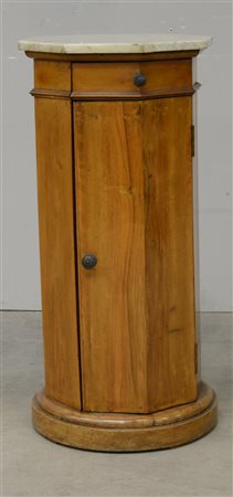 Comodino a colonna di forma ottagonale con cassetto ed anta, piano in marmo. Sec. XIX (cm 42x90x42) (difetti)