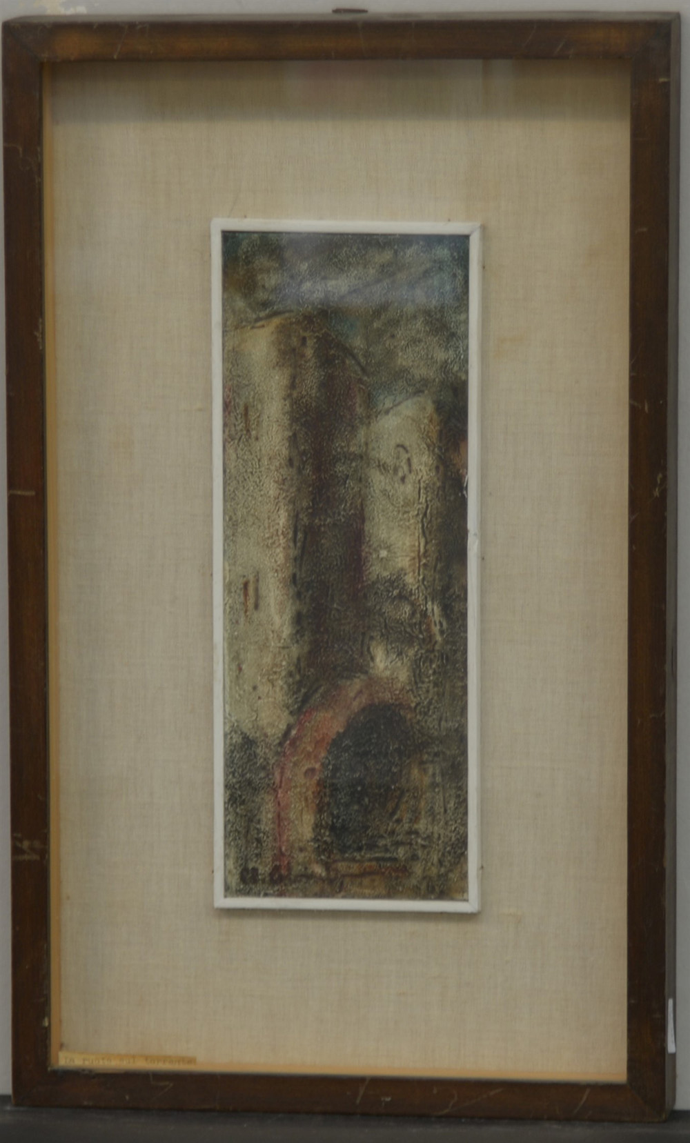 Firma indecifrata. "La ruota sul torrente", tecnica mista su masonite (cm 26x10) in cornice