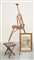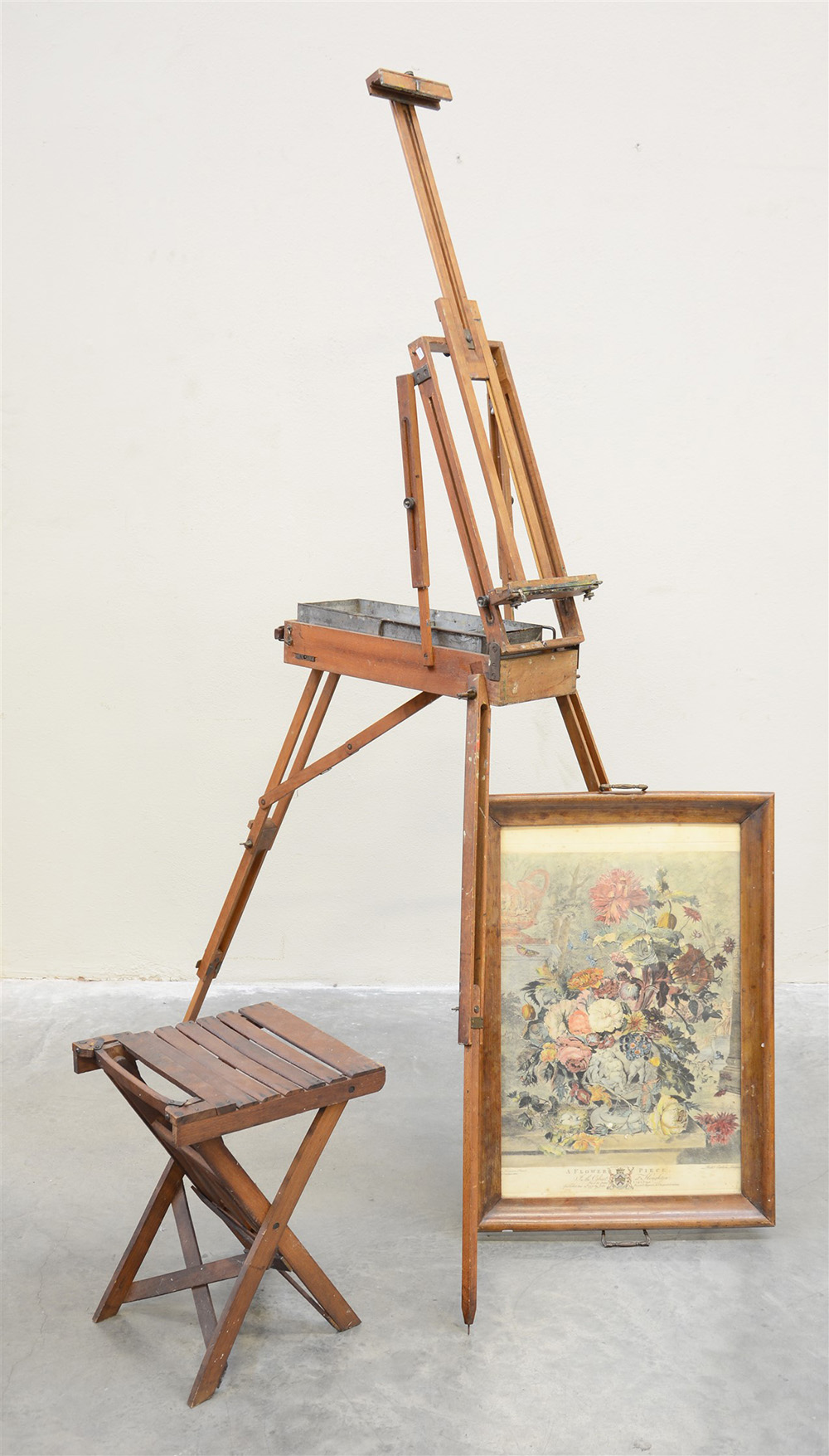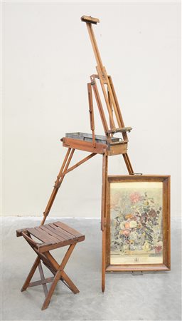 Lotto composto da un vassoio biansato in legno decorato con stampa ed un cavalletto da pittore con sgabello (difetti)