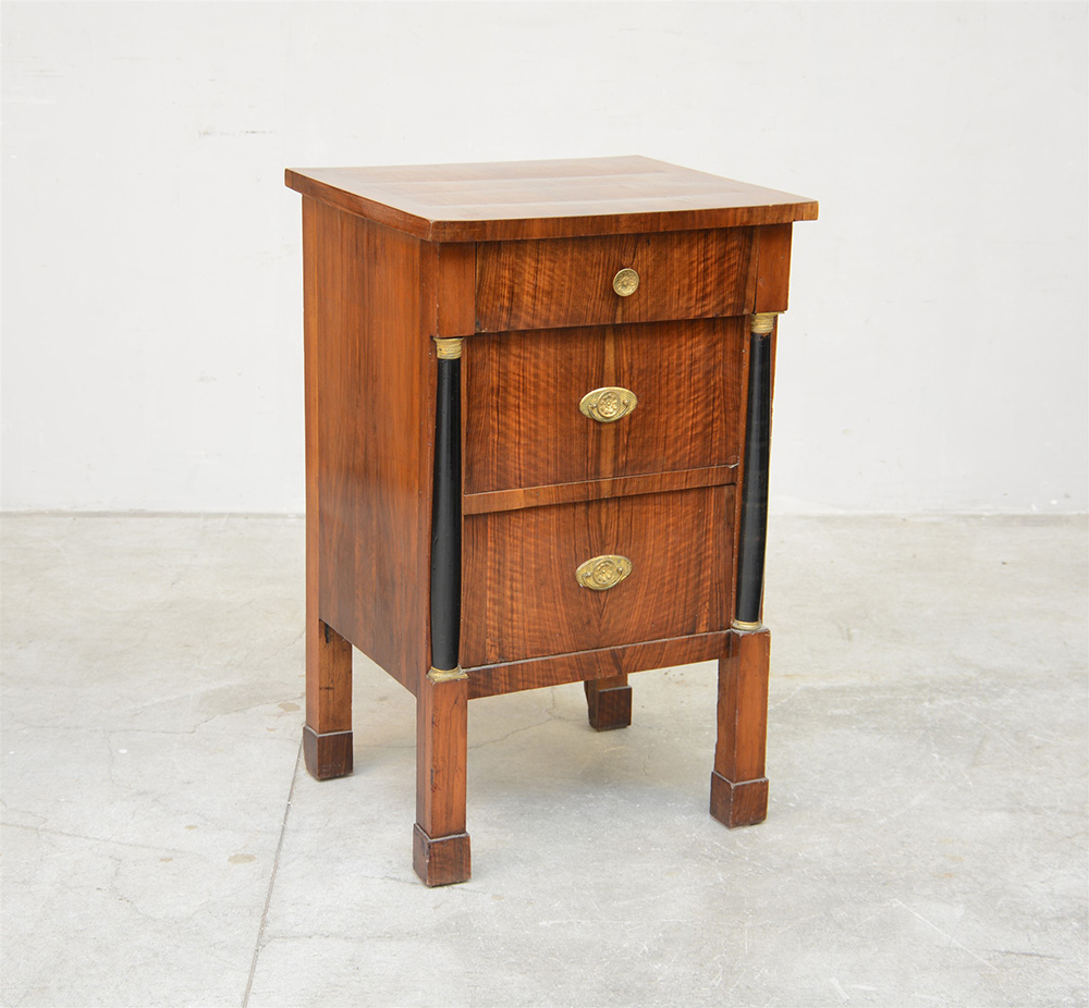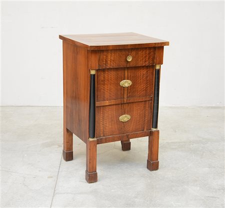 Comodino lastronato in noce a due cassetti con montanti a mezza colonna ebanizzata con capitelli in bronzo, gambe a parallelepipido (cm 57x91x49) (difetti e restauri)