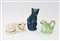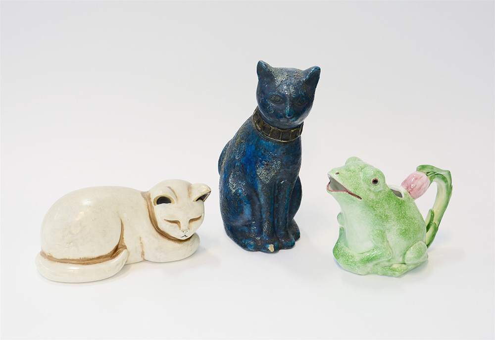 Lotto di tre oggetti in ceramica e terracotta raffiguranti gatti e ranocchio, manifatture e decori diversi (difetti)