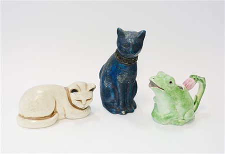 Lotto di tre oggetti in ceramica e terracotta raffiguranti gatti e ranocchio,...