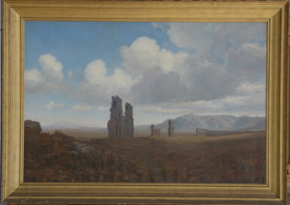 Firma indecifrata "Paesaggio romano con rovine" 1865 olio su tela (cm 90x135) firmato, datato, locato Roma ed iscritto in basso a destra, in cornice (difetti)