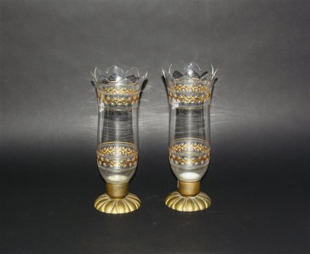 Coppia di candelieri con base in bronzo e campane in vetro, decorate a dorature