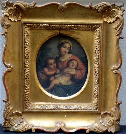 Scuola del sec. XIX "Madonna con Gesù bambino e s. Giovannino", olio su tela applicata su tavola (cm 10x 9) in cornce sec. XIX (difetti)