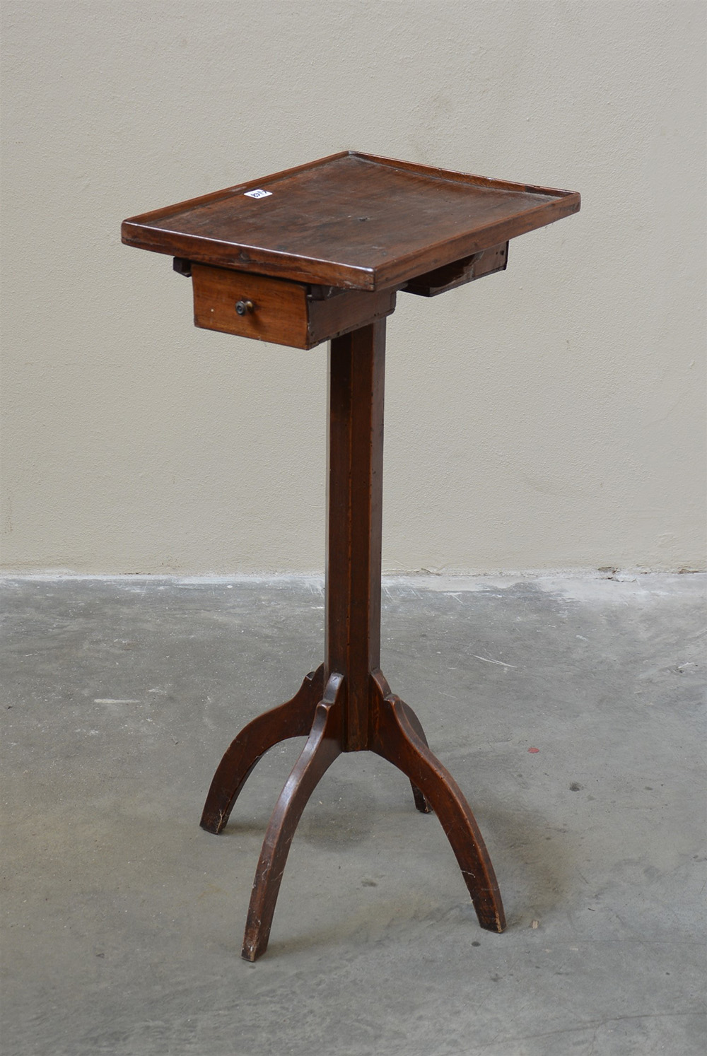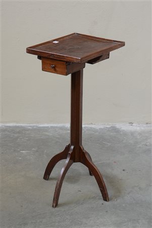 Tavolino a due cassettini sottopiano, gamba centrale sfaccettata terminante a quattro piedi curvi. Secolo XIX (cm 36x74x28)(difetti)