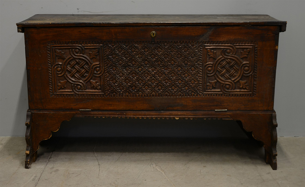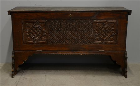 Cassapanca con fronte intagliato a fiori e volute. Sec. XIX (cm 140x80x46)