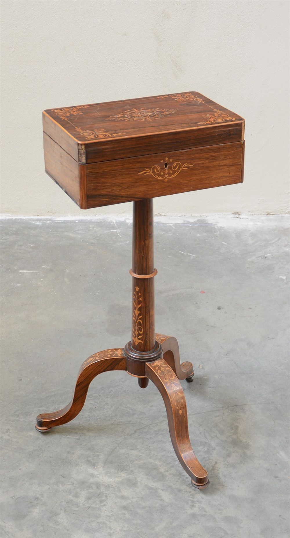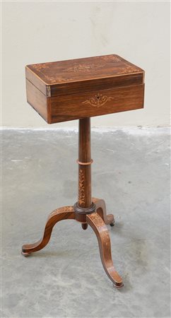 Tavolino da lavoro con pianetto apribile lastronato ed intarsiato in legno chiaro a motivi vegetali, gamba centrale tornita terminante a tre piedi sagomati. Secolo XIX (cm33x73x21)(difetti)