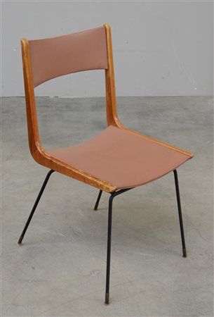 Sedia in legno e finta pelle, gambe in ferro, secolo XX